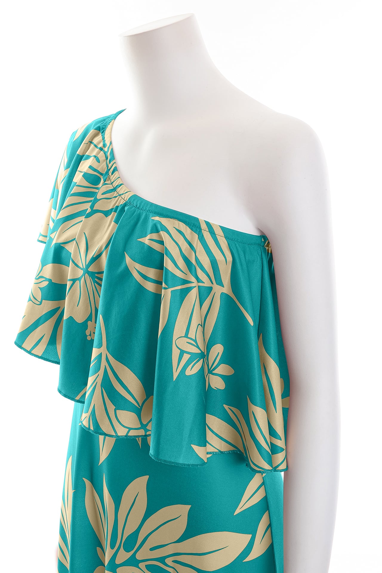 斜めに走るワンショルダーラインと重ねたフリルが印象的。
